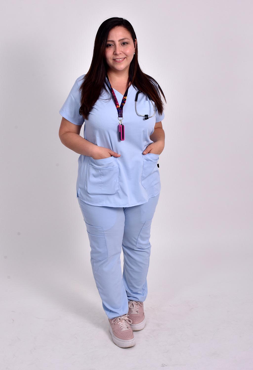 Ambo confeccionado en Arciel Flex con chaqueta de escote en V. Cuenta con tres bolsillos delanteros, uno superior, bolsillo sastre sutil, y dos inferiores expuestos y con compartimentos, ideales para mantener tus herramientas de trabajo organizadas. También, en la espalda, cuenta con una tira ajustable para adaptarlo como más te guste.