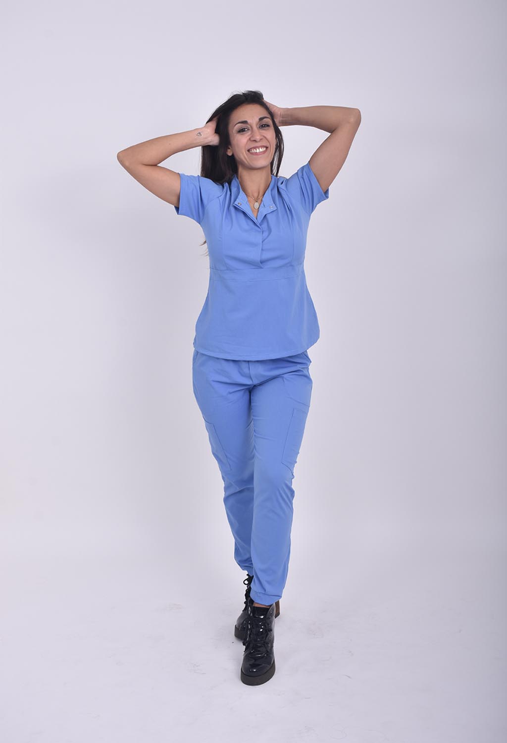 Ambo confeccionado en Arciel Flex. La chaqueta cuenta con un canesú en la parte superior que divide la prenda en dos, para acentuar tu figura, con cuello solapa, broches (para abrir y cerrarlo, cómo más te guste), y de mangas cortas. En la parte inferior de la chaqueta presenta un sutil evasé, dónde posee dos bolsillos laterales escondidos.