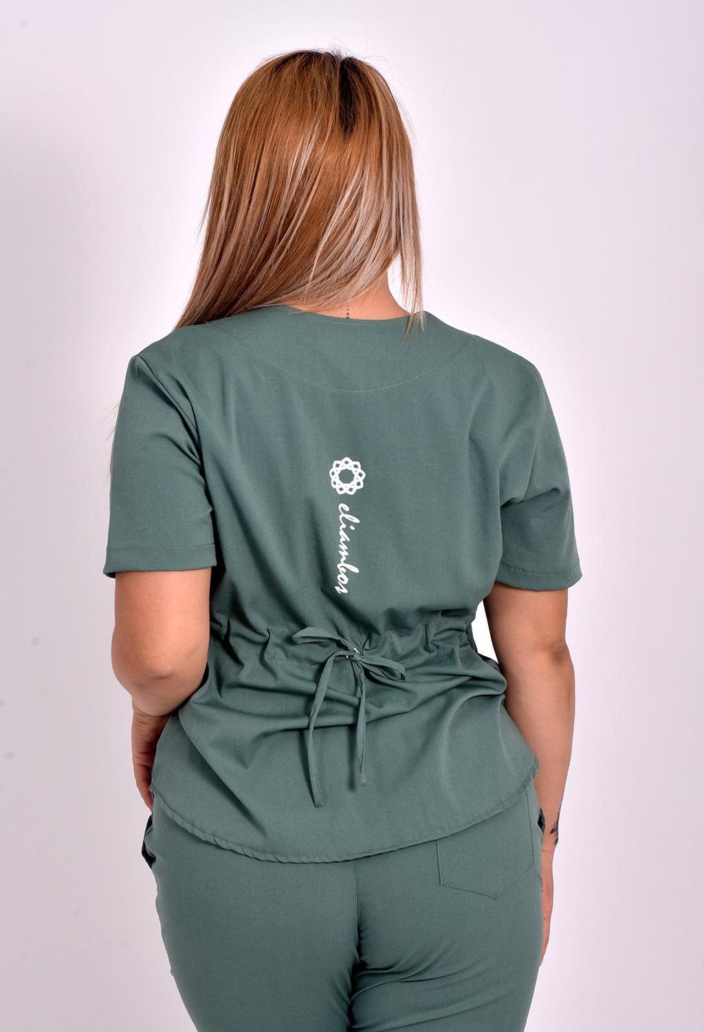 Ambo confeccionado en Arciel Flex. Cuenta con una chaqueta de mangas cortas y escote en V con detalle de color. Tiene tres bolsillos ojales delanteros, uno en la parte superior izquierda y dos inferiores en bolsillo profundos (para que no se caiga nada). Además, incluye tira ajustable en la espalda.